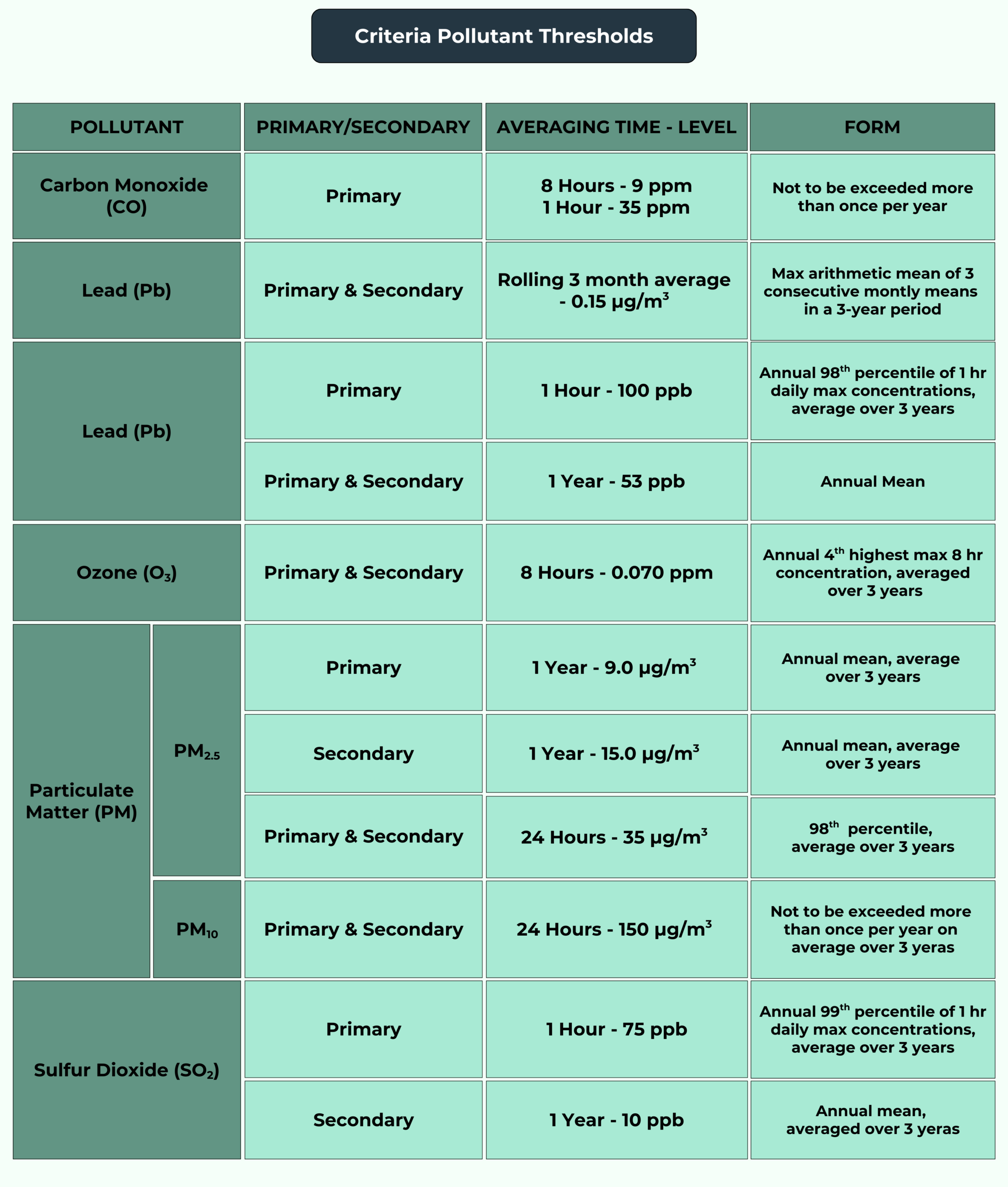EPA establishes quantitative thresholds for each criteria pollutant within the NAAQS program to determine allowable levels in ambient (i.e. outdoor) air.