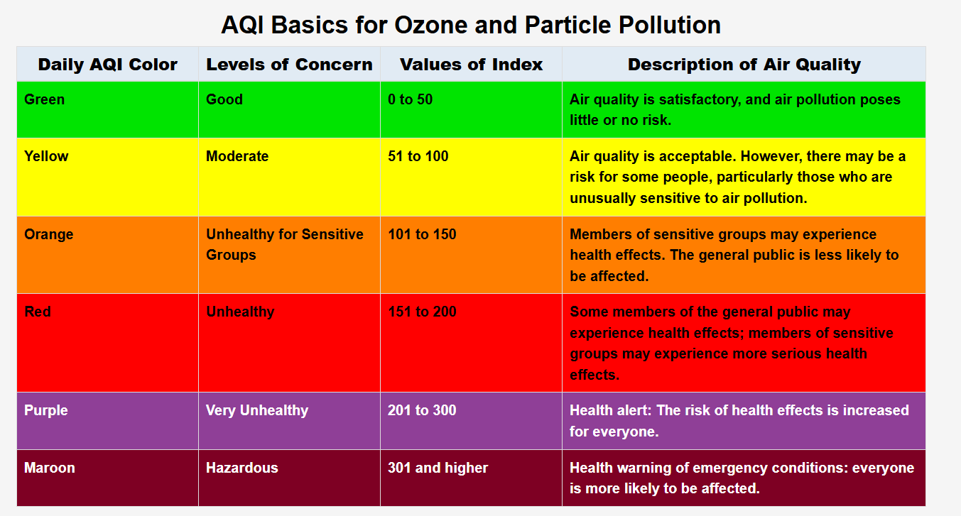 The Air Quality Index (AQI) is a tool used to communicate daily air quality to the public. The AQI converts measured ambient concentrations of criteria pollutants into a simple color-coded scale ranging from “Good” to “Hazardous.” The higher the AQI values, the poorer the air quality and increased health concerns.