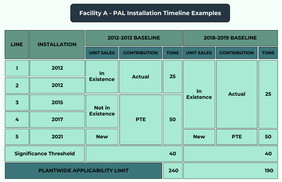 The earlier baseline resulted in a significantly larger limit, since more units (those “not in existence”) could be accounted for using their PTE. As demonstrated by this simple example, the baseline period is an important factor when considering the benefits of a PAL. The definition of “Not in Existence” as clarified in the 2020 memo could provide facilities with the opportunity to set a PAL with desirable room for operational flexibility.